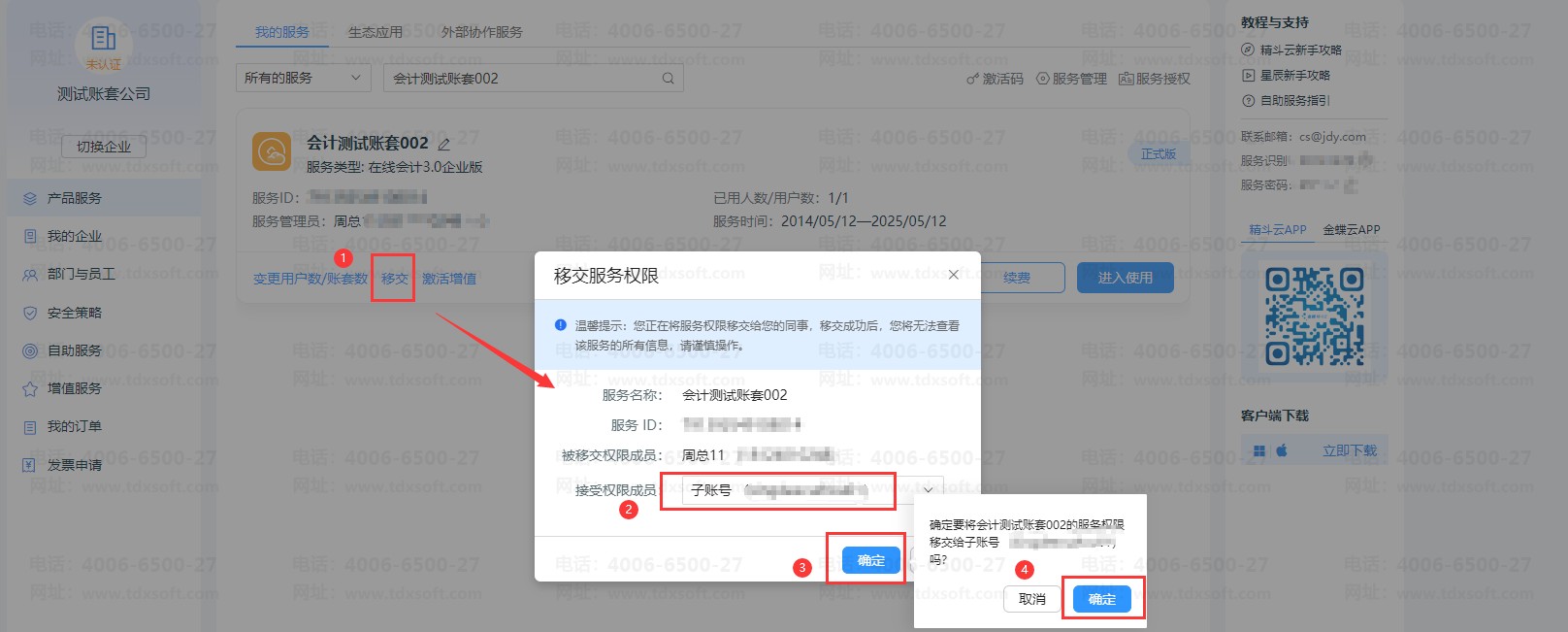 服务类型为在线会计代账公司版,不支持直接移交,需要提交资料申请后台处理。