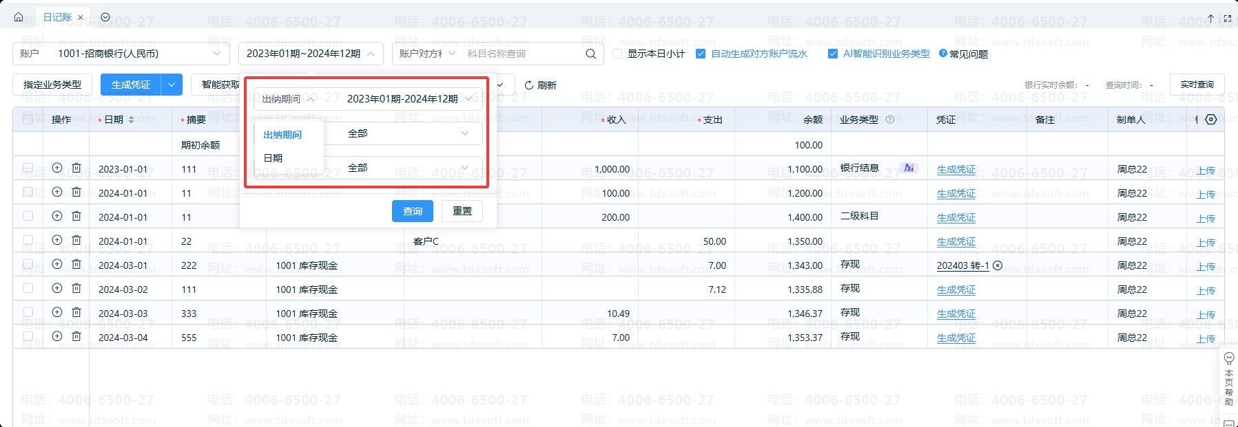 1、检查录入及导入的日记账期间/日期,然后在系统选择相应的期间/日期查询。