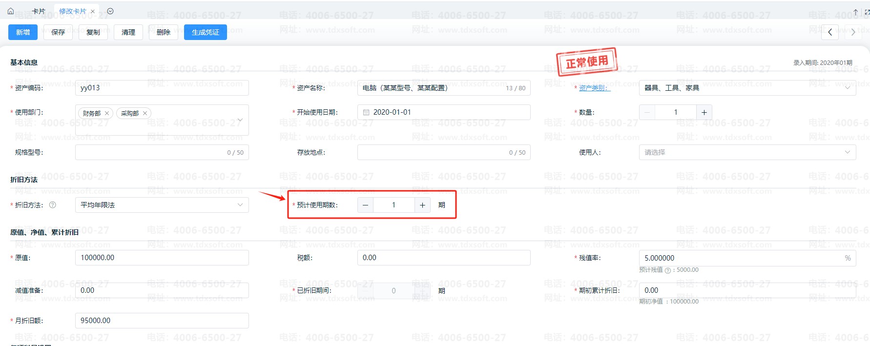 点击【资产】-【卡片】进入卡片列表,点击左侧操作列下的修改按钮,进入卡片进行界面修改卡片预计使用期数,修改的数值为已折旧期间数+1,结账到下期后系统会把余下的全做为一期处理。如图: