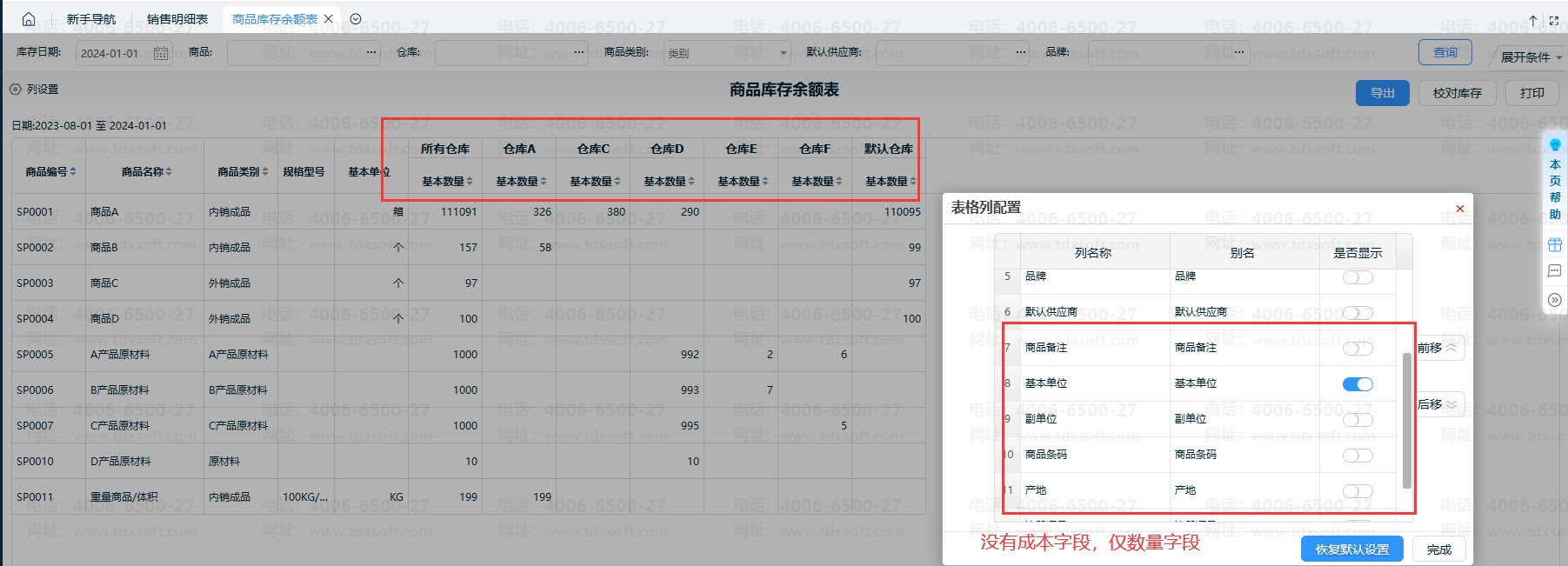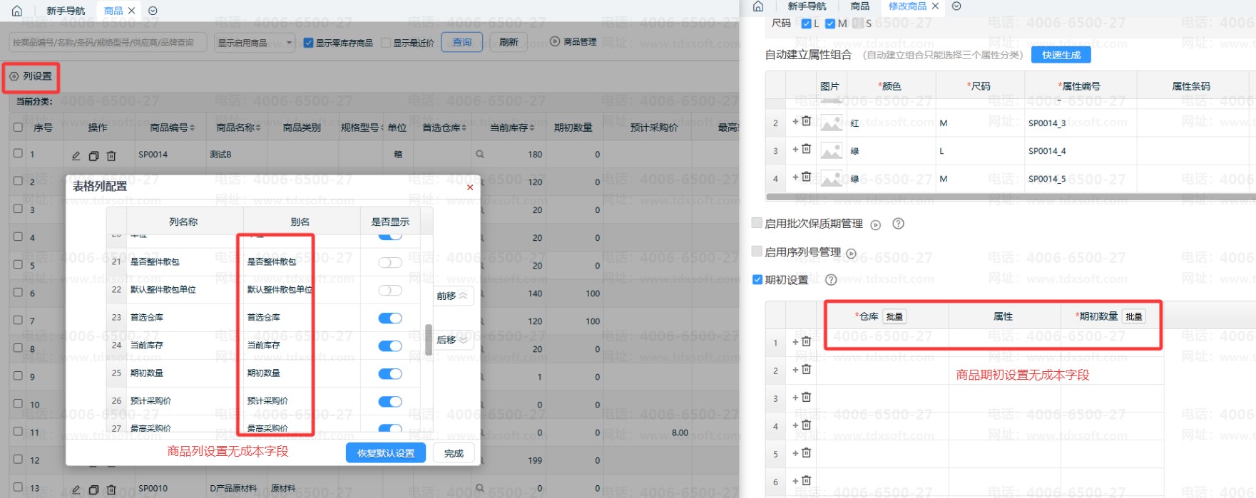 若未授权成本查看权限,则无法查看系统成本数据,如商品列表的期初成本、仓库报表的商品出入库成本等。