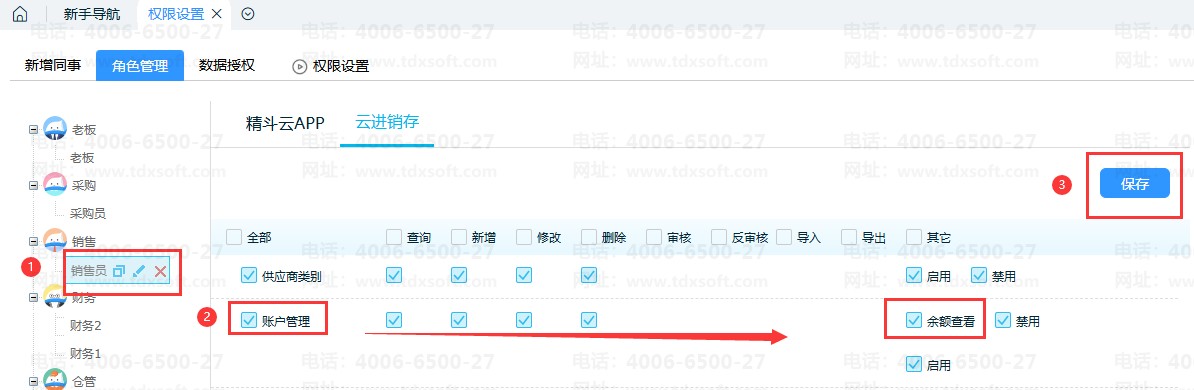 在【设置】-【权限设置】-【角色管理】,选择子账号对应的角色,如“销售员”