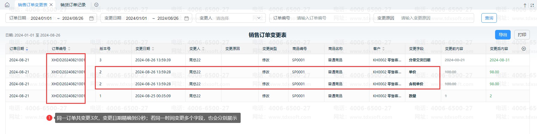 ②变更表会展示变更字段、变更方式、变更前内容和变更后内容等;另外,若同一笔订单有多次变更;会按变更的先后顺序生成对应的【版本号】,有迹可寻。