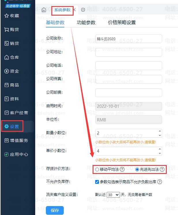 1、【设置】-【系统参数】,可查看成本计价方法,目前系统支持移动平均法和先进先出法