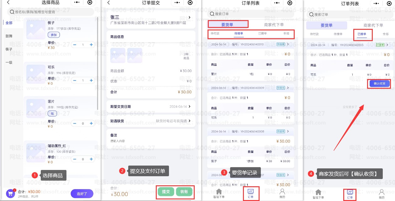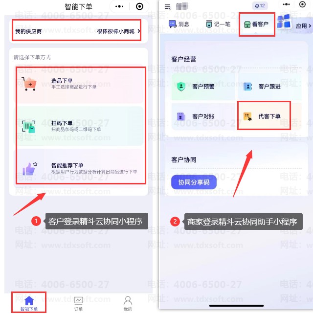 支持客户直接下单(生成要货单),商家代客下单(生成销货订单)