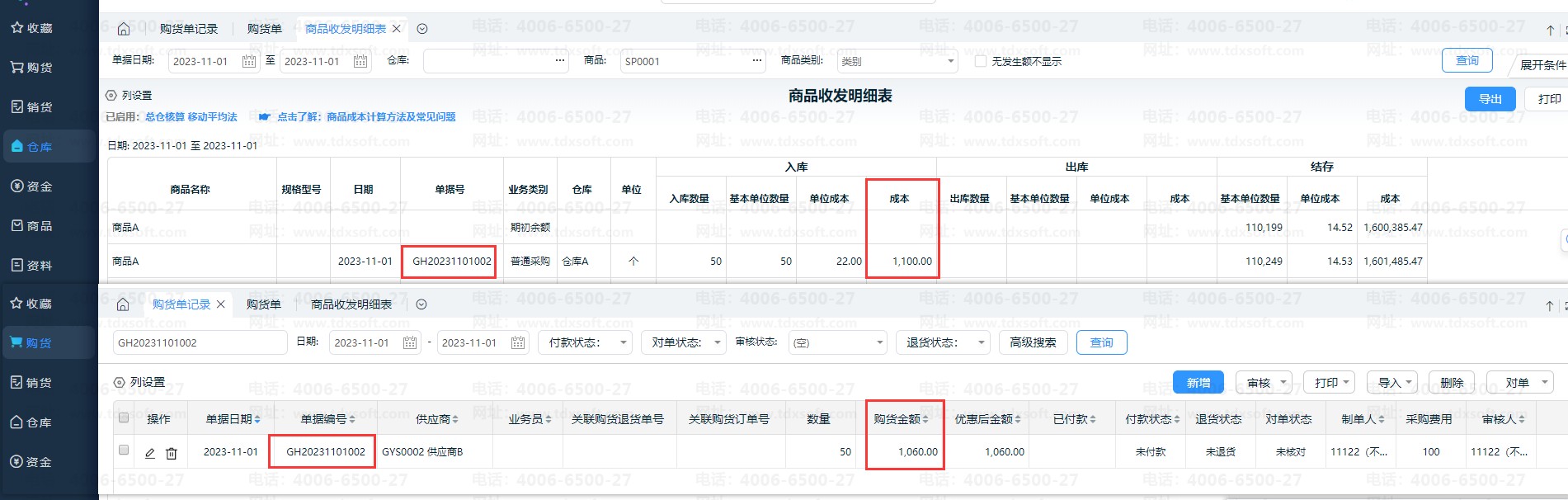 如图所示,同一笔购货单据,同一商品,购货单的购货金额与商品收发明细表不一致