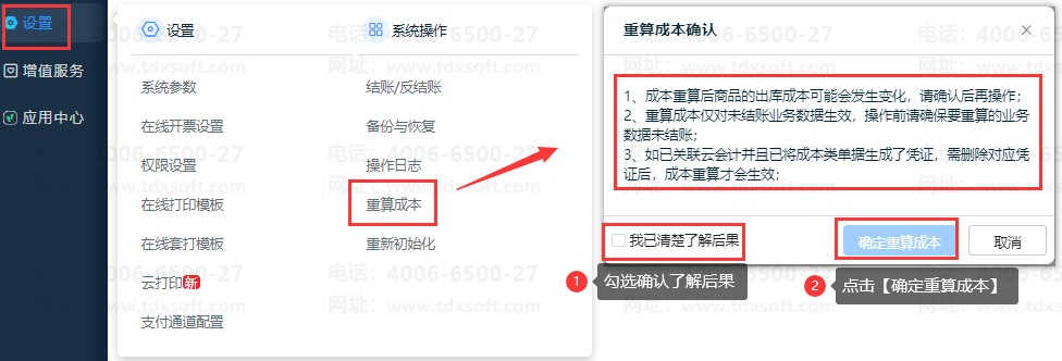 2、备份成功后,点击【设置】-【重算成本】,弹出重算成本确认对话框: