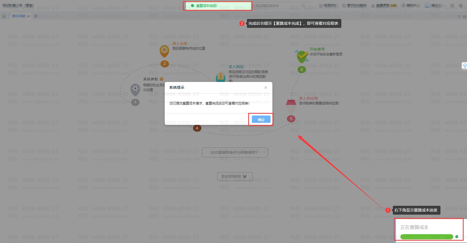 3、确定后,右下角可查看重算成本进度,完成后会有相关提示,如图: