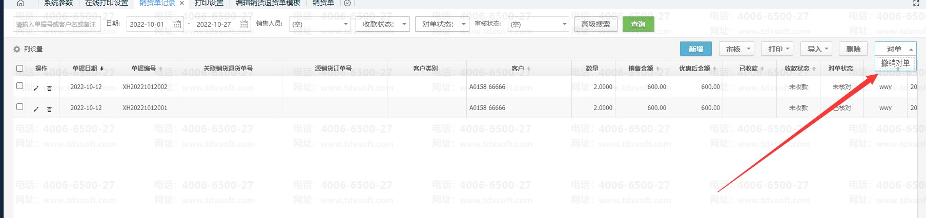 销货单记录界面的对单是什么意思?