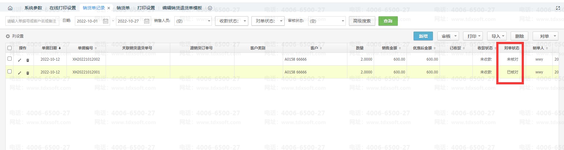 对单:一般是指财务根据公司实际情况的原始单据到系统里面与该单据进行核对后,确认单据无误,即可在销货单记录界面选择对应的销货单,点击右上角的对单,对单状态就会显示已对单了,标识这张单据是与客户确认过的。