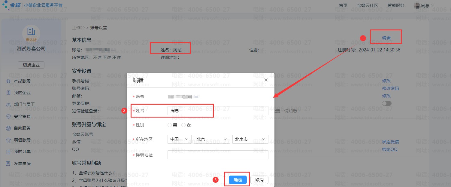 2、在账号设置界面的【基本信息】-【编辑】-更新【姓名】-【确定】即可(姓名即为制单人/审核人)。