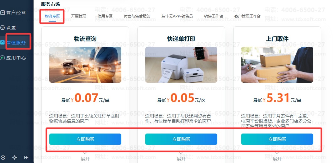 ①菜单栏点击【增值服务】先购买相应的物流服务;