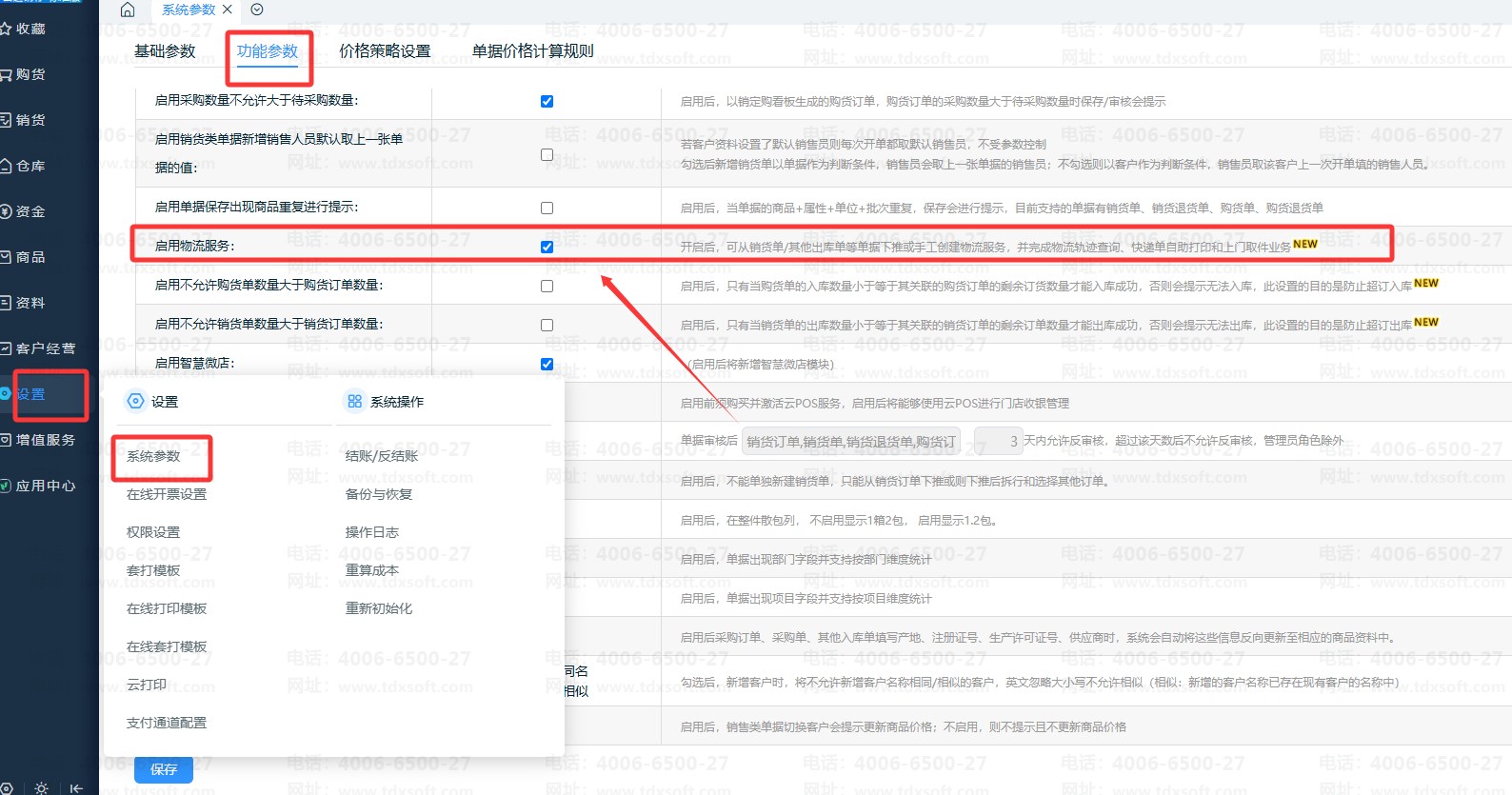 ②打开【系统设置】-【系统参数】-【功能参数】启用物流单功能;