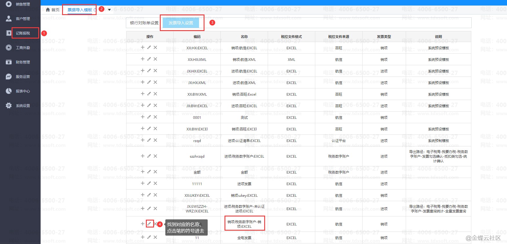 1、账无忧首页(未进账簿前),点击【记账报税】→【票据导入模版】→【发票导入设置】界面,选择打开导入发票时选择的模板点击笔的符号后打开