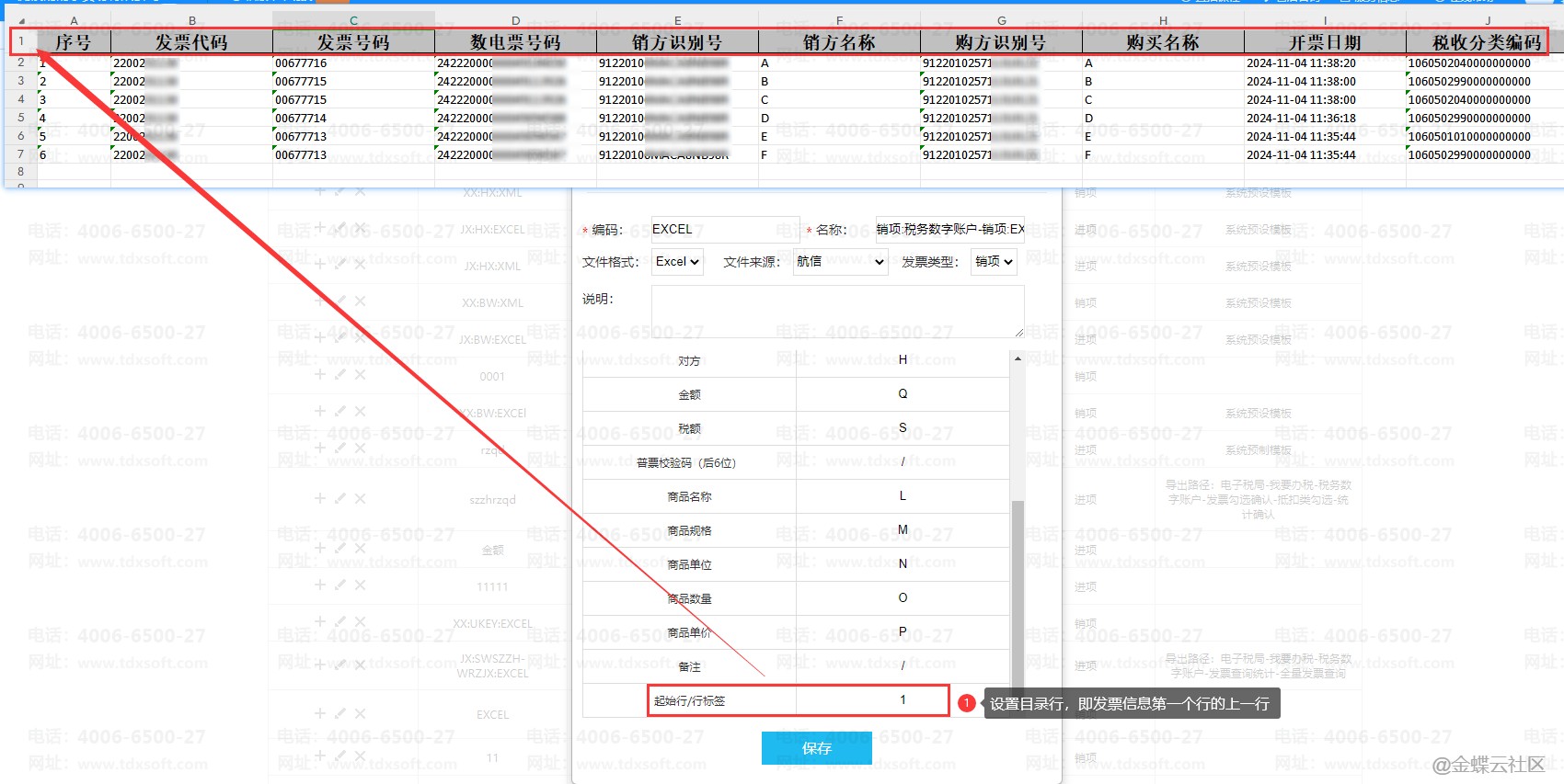 2、在修改模板界面,下划找到“起始行/行标签”,打开发票文件目录行是哪个行次,以截图举例,目录行是第一行,对应“起始行/行标签”填写1,再点击【保存】按钮。