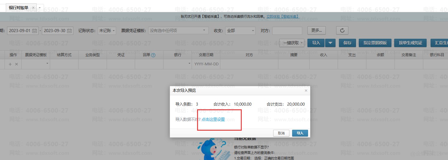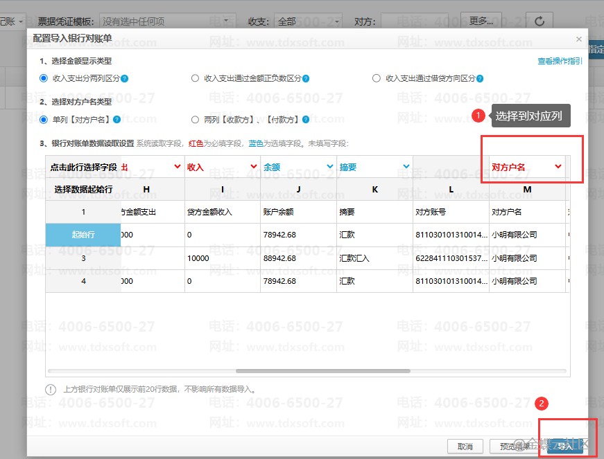 系统识别银行对账单表格数据成功后,会展示本次导入预览弹窗,“点击这里设置”进去配置界面,找到对方名称行列,设置为对方户名,然后检查没有问题后,点击【导入】按钮即可。