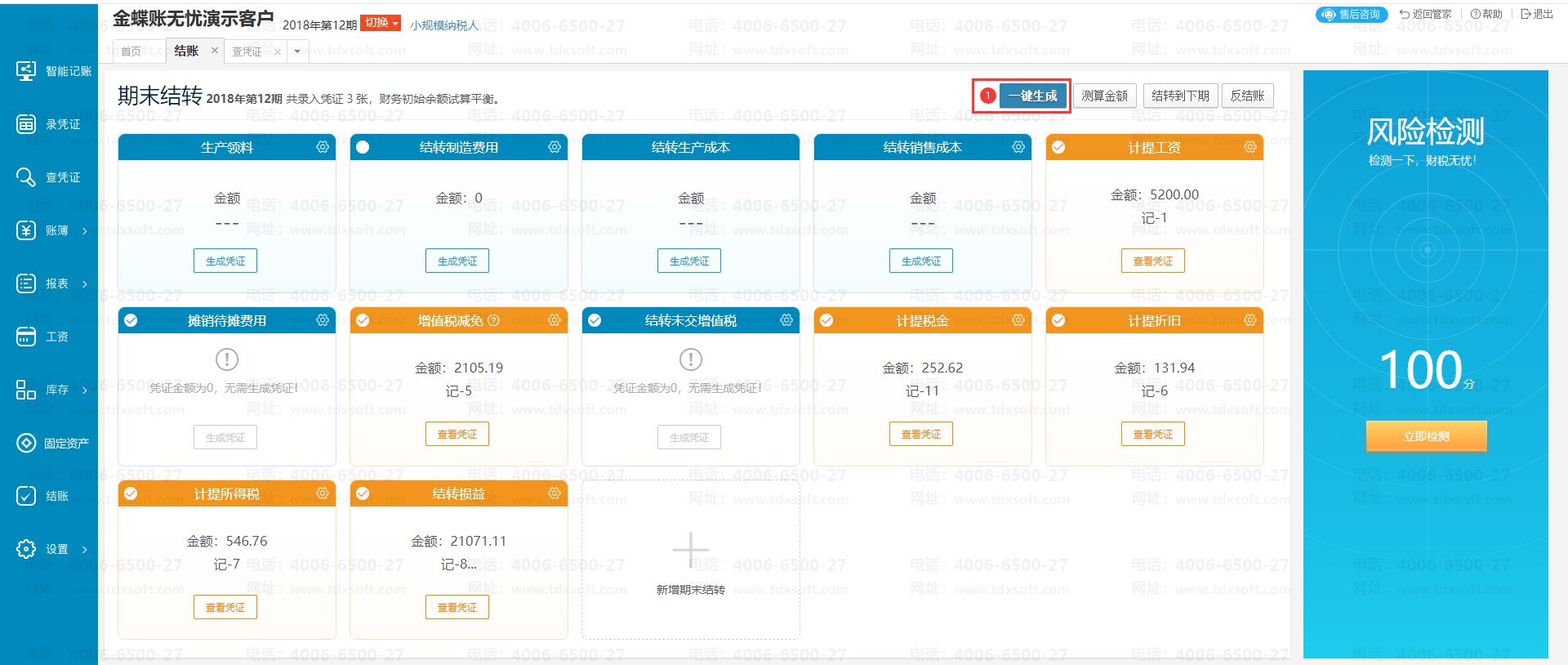 结账界面,点击【测算金额】 -- 【一键生成】 -- 【结转到下期】