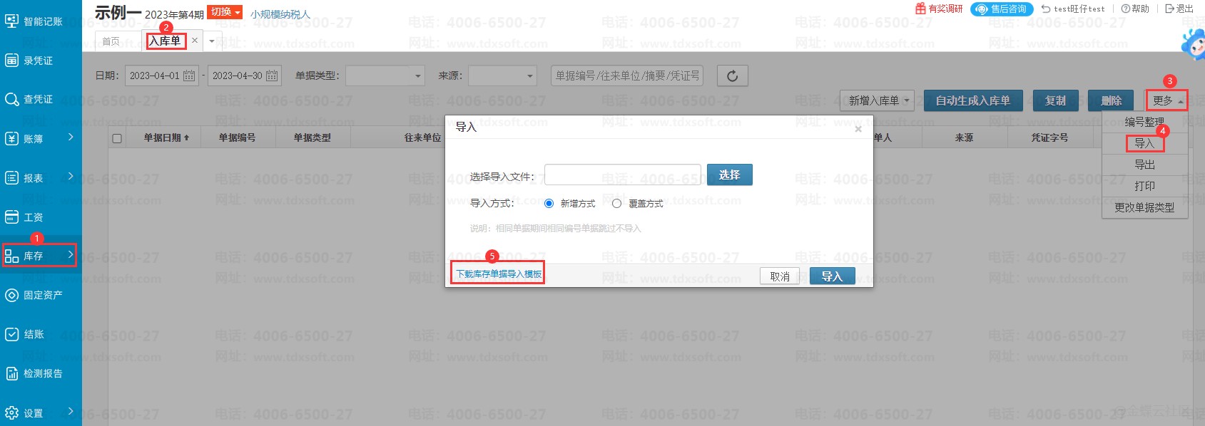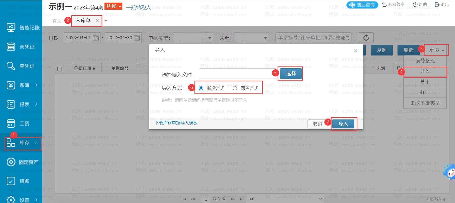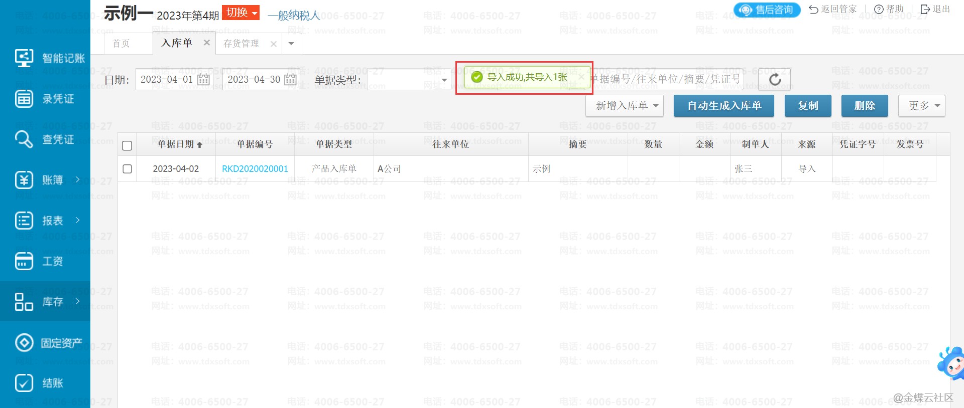 注:导入入库单的单据日期不能小于账期,例如当前账期是2023年4期,那入库单日期不能是2023年3月,如果需要导入之前账期入库单需反结账。
