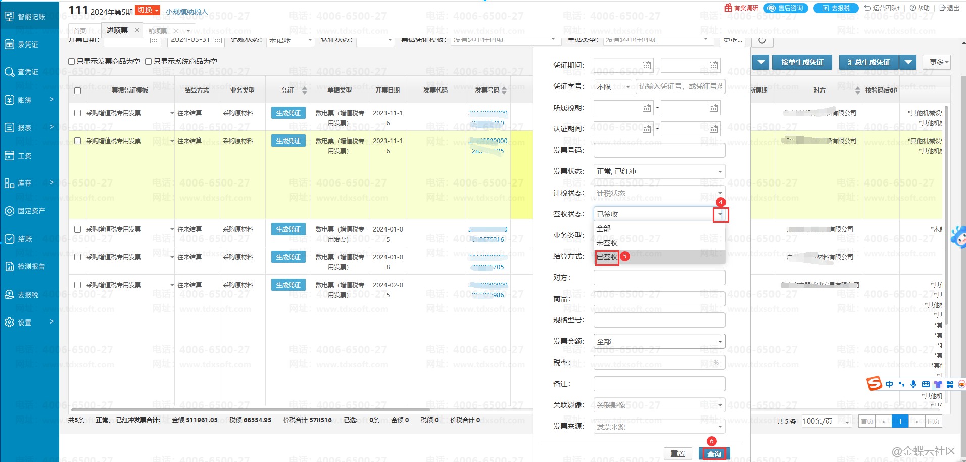 进入账簿后,点击【智能记账】→【进项票】/【销项票】进入界面后点击【更多...】→【签收状态】选择已签收后点击【查询】即可查询到已签收状态的发票数据了。