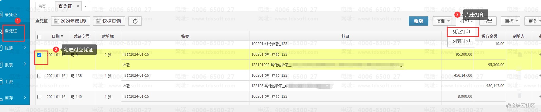 【操作步骤】:1、进入账簿后打开【查凭证】勾选要打印的凭证后点击【凭证打印】