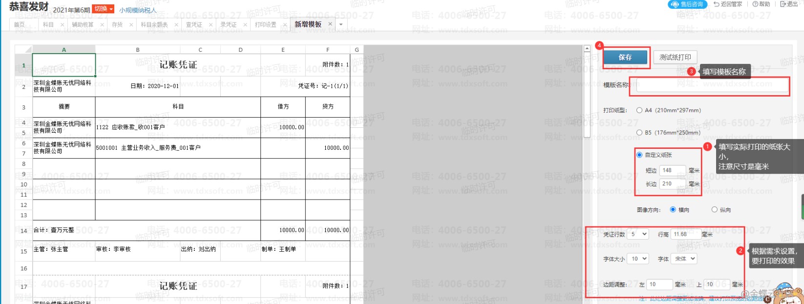 如果没有合适的纸张模板,可以自己新增打印模板,点击【添加打印模板】+号按钮根据您的纸张尺寸需求设置好后点保存,然后进行打印(参考下图示例尺寸148*210)