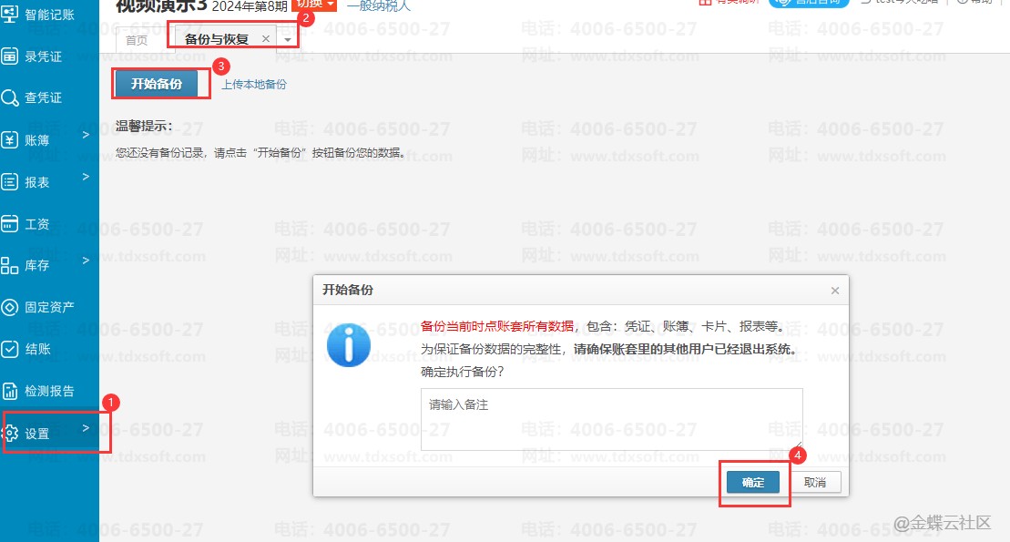 (1)以防操作失误,建议先备份账套:【设置】→【备份与恢复】→【开始备份】。