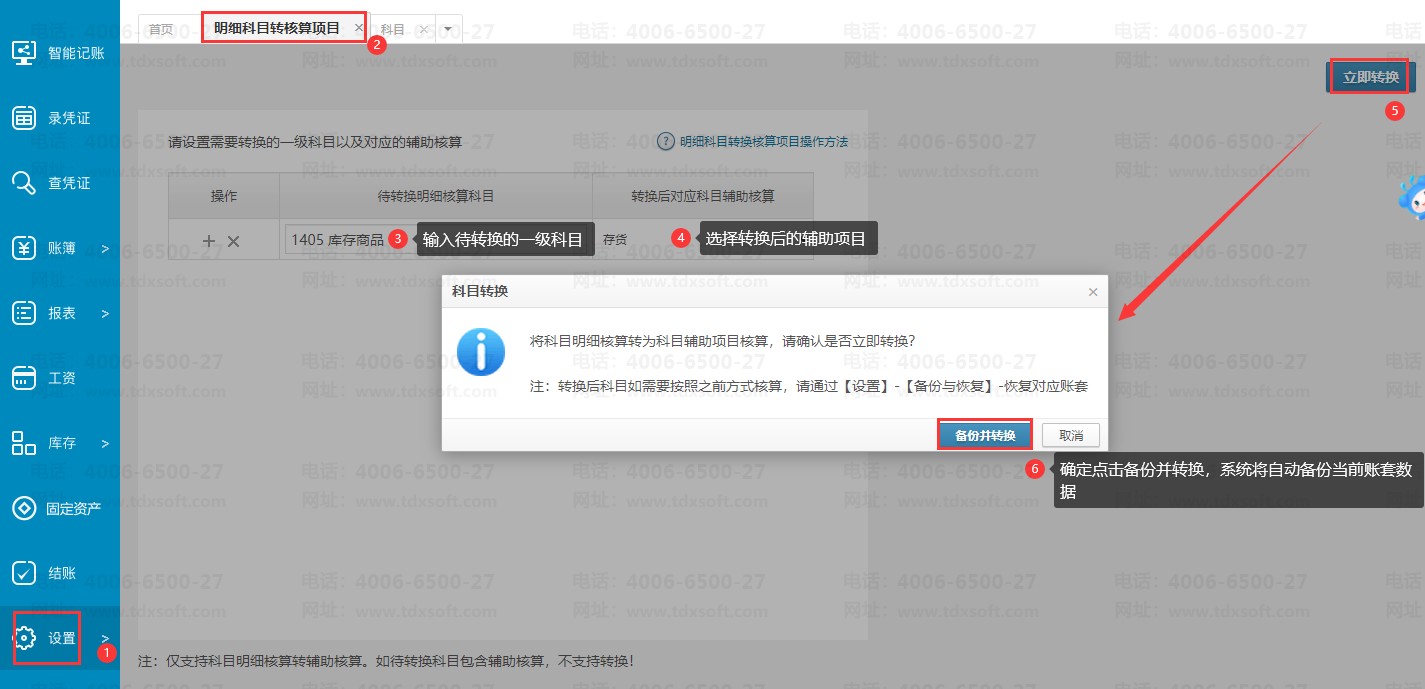 进账簿选择【设置】 →【明细科目转核算项目】一栏,待转换明细核算科目和转换后对应科目辅助核算必须填写,待转换明细核算科目须是一级科目。