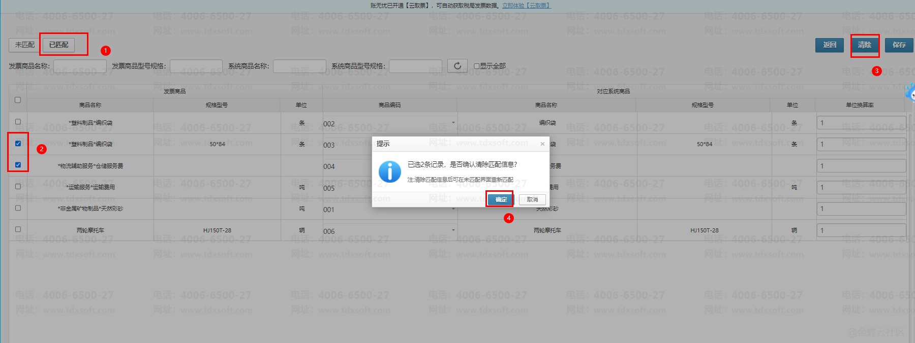 进入匹配系统商品界面,选择“已匹配”,勾选需要清除的商品,点击【清除】按钮,再点击【确定】按钮,最后点击【保存】按钮即可。