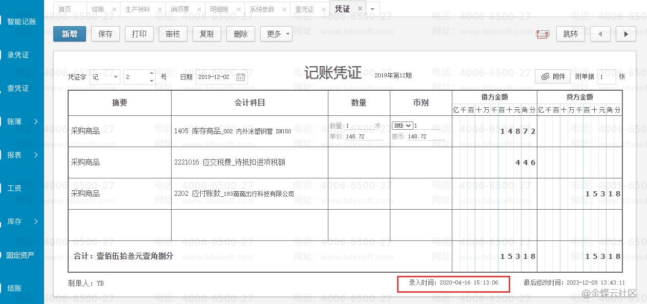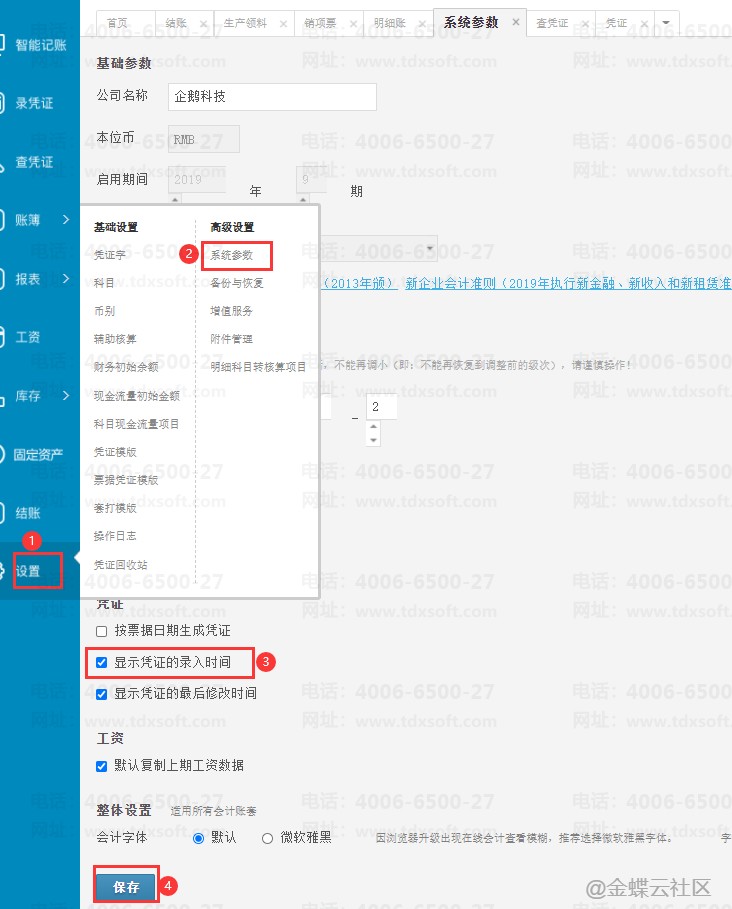 进账簿后点击【设置】→【系统参数】,取消勾选【凭证】下面的【显示凭证的录入时间】,点击【保存】后,重新进入录凭证或者查看凭证界面不会显示录入时间。