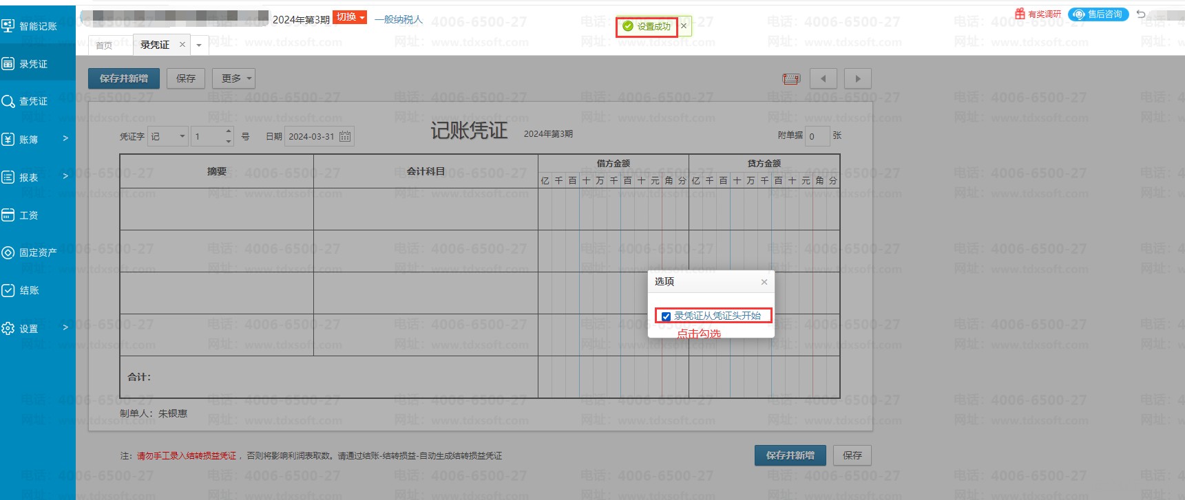 系统默认进入录凭证界面是先录入摘要,如果需要从凭证字开始录入,可以点击【录凭证】→【更多】→【选项】,勾选“录凭证从头开始”即可。设置完成后刷新页面后生效。