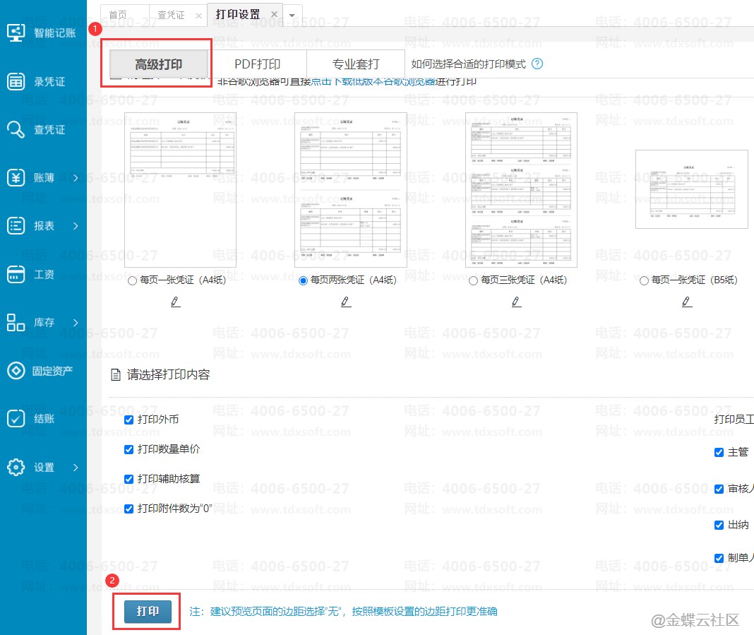 金蝶账无忧高级打印怎么取消显示页眉页脚