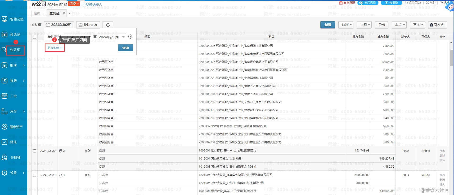 进入账套后点击【查凭证】在查凭证界面后可以点击期间,然后点击【更多条件】展开界面后可以根据需要在【凭证字号】框中手动输入需要查询的凭证号或者是凭证号范围,比如1,3,5-7后点击【查询】。查询到的凭证可以勾选上然后点击右上角的【更多】→【导出列表】导出的EXCLE表格里面显示的即为需要的凭证号凭证信息。
