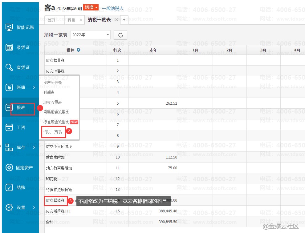 举例子:在【报表】→【纳税一览表】→【税种】查看到系统已有【应交增值税】名称科目,则新增/修改的科目名称可以换成应交增值税2023