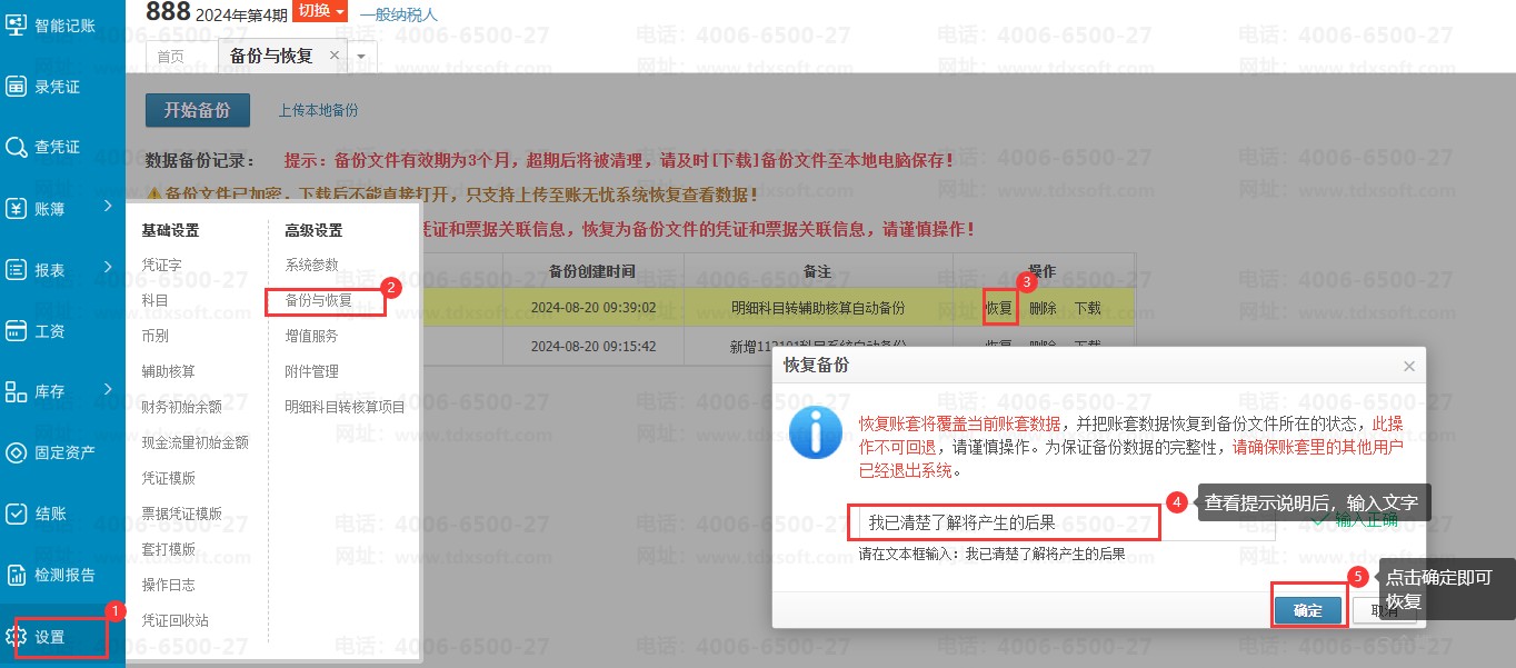 在操作转辅助核算时,系统会自动进行备份账套,后续可直接点击【设置】→【备份与恢复】找到对应账套后点击恢复,方可恢复到转辅助核算之前的账套科目状态。