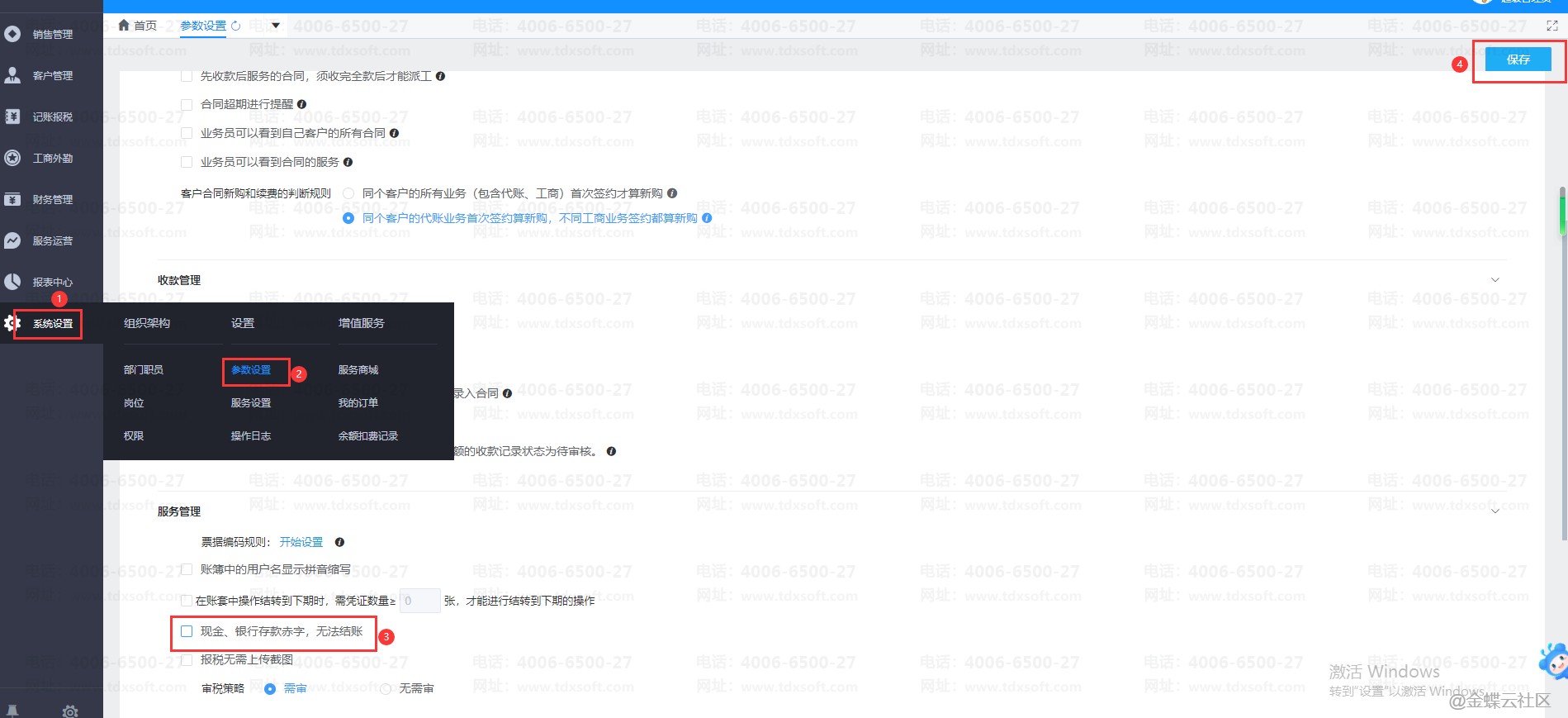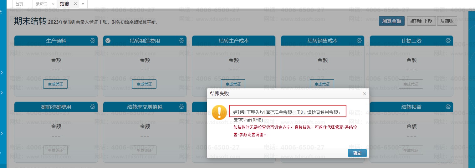 登录账无忧点击【系统设置】→【参数设置】→【服务管理】取消勾选“现金,银行存款赤字无法结账”,取消之后点击【保存】按钮,再重新进入结账界面操作结账即可。