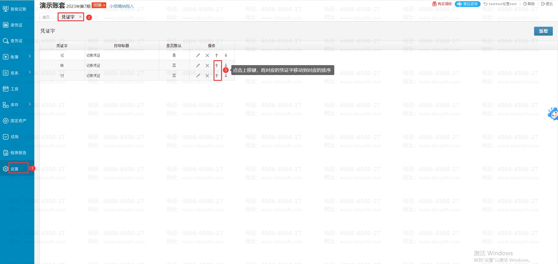 进入账套后点击【设置】→【凭证字】,在对应需要进行调整排序凭证字旁点击“↑”上移键,移动到对应的顺序即可。