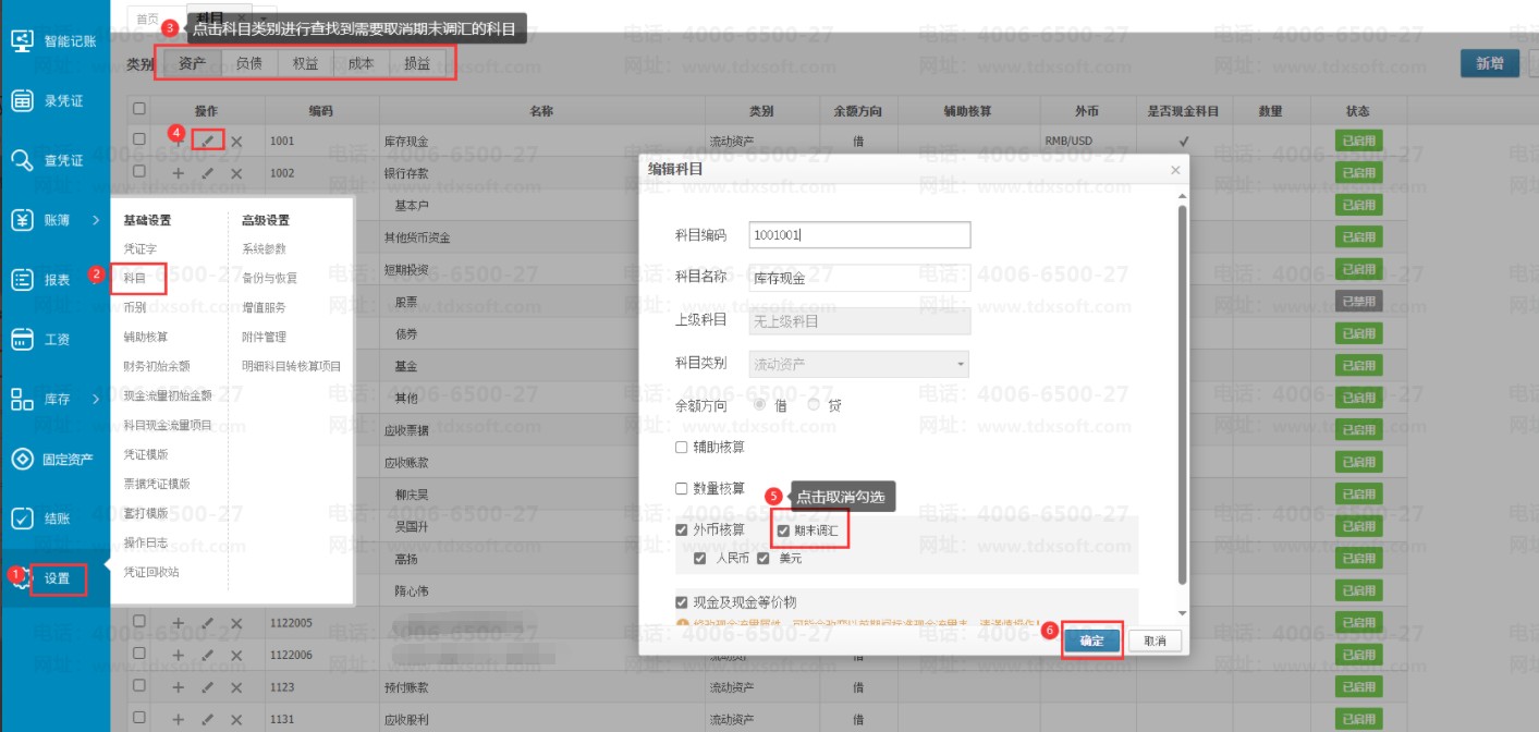 进入账套后,点击【设置】→【科目】,进入科目页面,点击科目类别进行查找到该科目后,点击该科目操作列中间按键进行编辑科目,取消期末调汇勾选,最后点击【确定】即可。