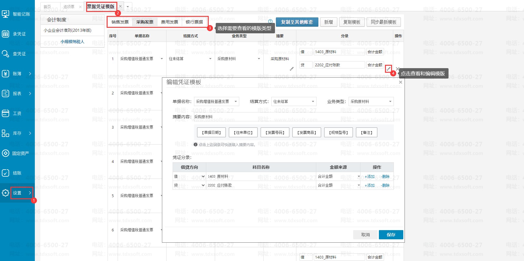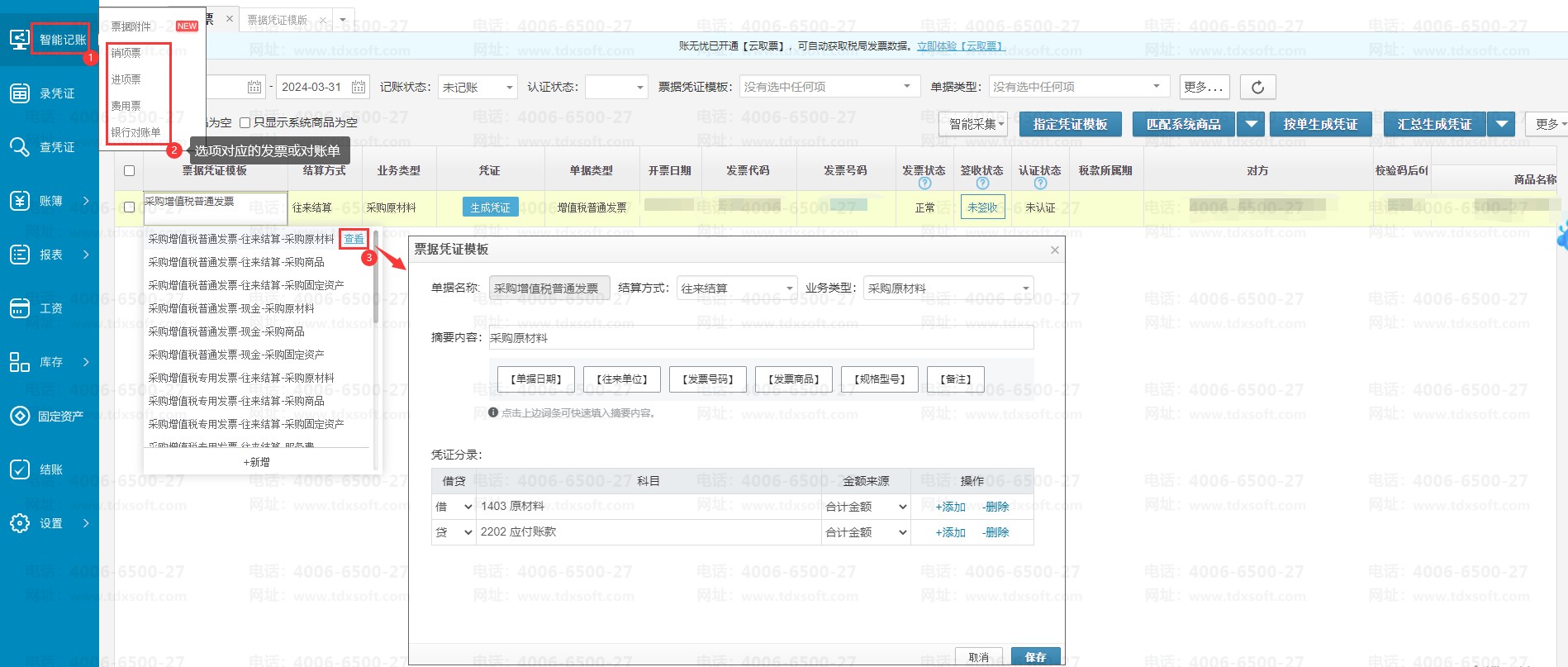 方法二:点击【智能记账】,选择对应的发票,然后找到和发票上一致的模板,点击【查看】即可检查票据凭证模版。