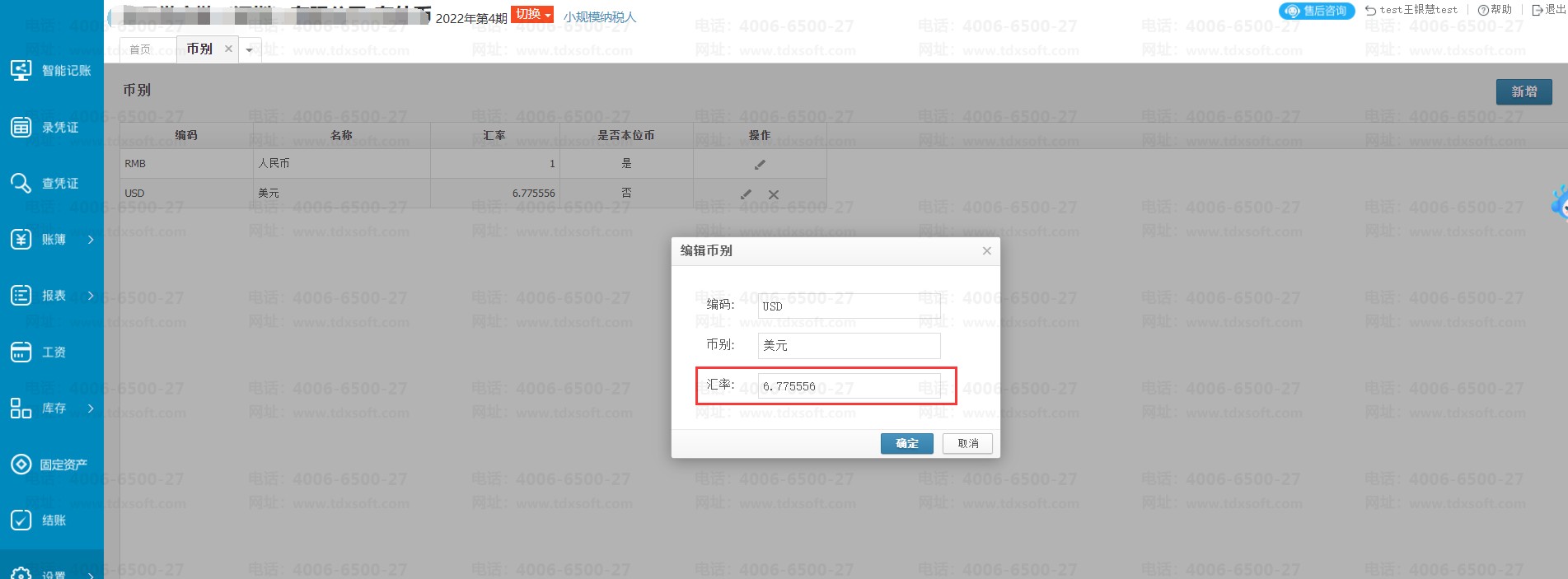 使用外币做账时,系统币别中的汇率支持录到小数点的后六位,如图所示