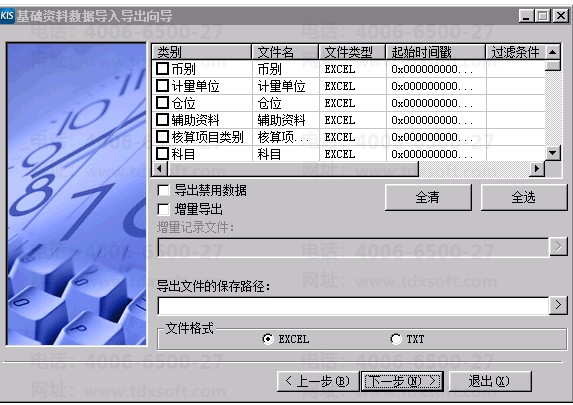 4、选择【基础资料】交换对象后,鼠标左键数据交换平台界面左上角【新建任务】,选择导出基础资料或导入基础资料,鼠标左键点击【下一步】后选择具体的基础资料做处理。