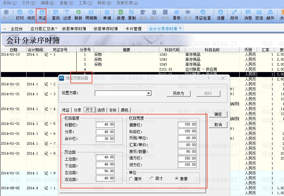 3、在序时薄界面单击菜单栏[文件]→[打印凭证]→[页面设置];