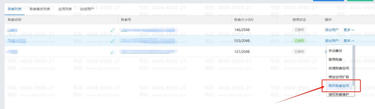 使用产品绑定的超级管理员账号登陆kisyun.kingdee.com-点击[进入企业]-进入[账套列表]-选择对应账套最右侧[更多]-[购买账套空间]