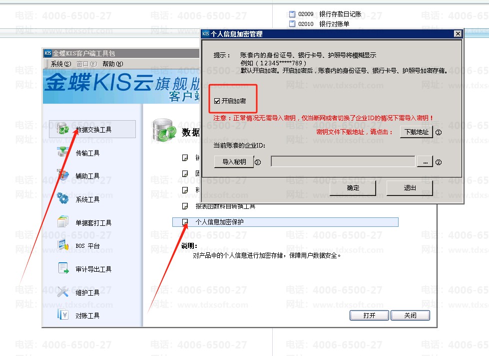 进入KIS主界面左上角【系统】-【客户端工具包】-【数据交换工具】-【个人信息加密保护】-取消勾选【开启加密】。详情如下图: