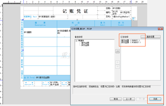 步骤三:在汇总管理中设置汇总依据字段及汇总字段后保存套打模板。