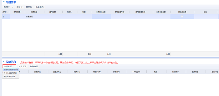 1、选择发票默认取下拉选项第一个按钮的功能,比如将“不生成费用明细”按钮从BOS调整顺序至第一个,则点击选择发票,会默认为不生成费用明细