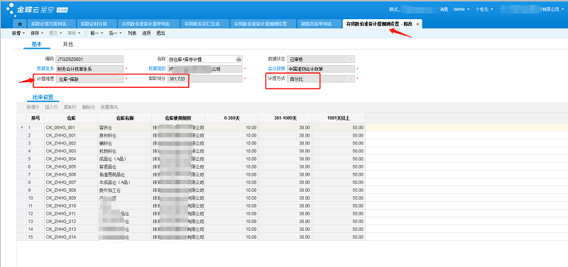 5.1 如果按照仓库+账龄计提,则直接用计提计算期间(比如说季度计提,那就是三月底或者六月底或者九月底)的期末库存账龄数据*对应账龄期间的计提比例计算得出,比如说某个物料的3月底的期末存货金额为100,而且都是属于第一个账龄期间(0到360天)的,则计提准备金额为100*10%=10元;