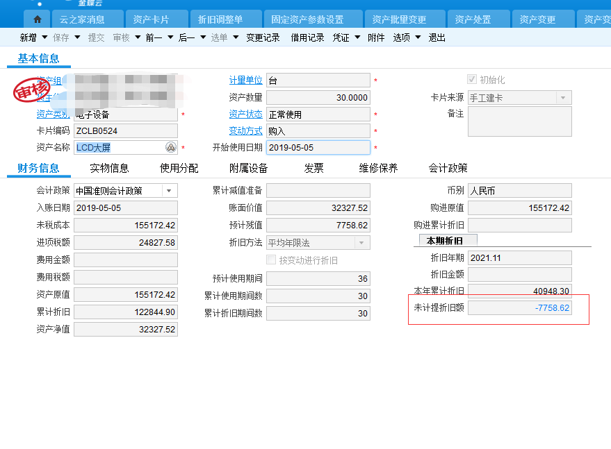 云星空折旧清单中当期减值准备调增了,未计提折旧额变成了负数