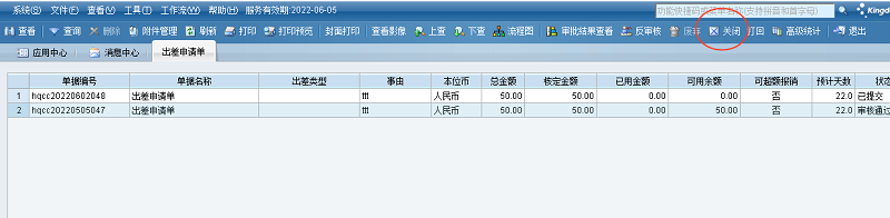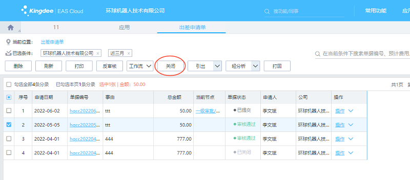财务在EAS Cloud网页端/客户端出差申请单序时簿选中需要关闭的出差申请单,点【关闭】按钮,费用申请单是否关闭成功会有相应的提示。