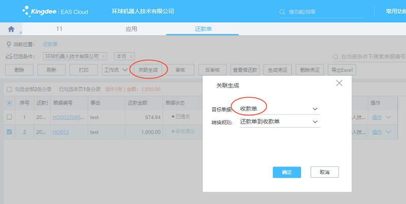 • 财务在EAS Cloud客户端还款单序时簿选中需要关联收款的还款单,点【关联生成】按钮系统通过单据转换规则生成收款单