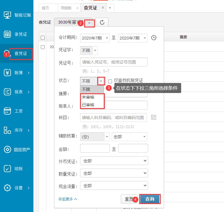 如何在账无忧中筛选出未审核凭证/已审核的凭证