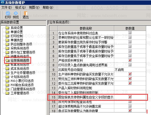 KIS云旗舰版系统参数维护--仓存系统选项--15固定报表支持物料属性自定义字段的显示,勾选该参数之后的使用方法和效果如下:
